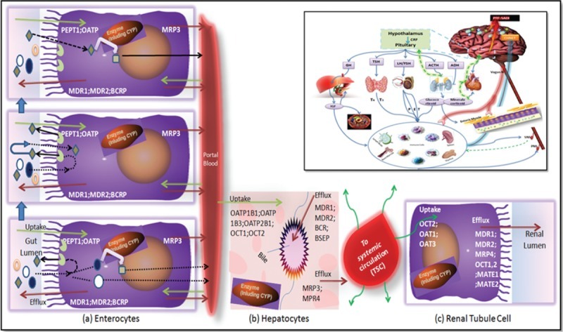 DME보다 덜 알려져 있지만, 막 수송체는 약물/약초의 PK-PD에 중요한 영향을 미칠 수 있습니다. 그러나 간과 장에 주로 집중되어 있는 DME와 달리 수송체는 신체의 모든 조직에 다양하게 존재하며 약물의 흡수, 분포, 조직 특이적 약물 표적화 및 제거에 중요한 역할을 합니다(그림 2a). .(그림 44).10,101,117
