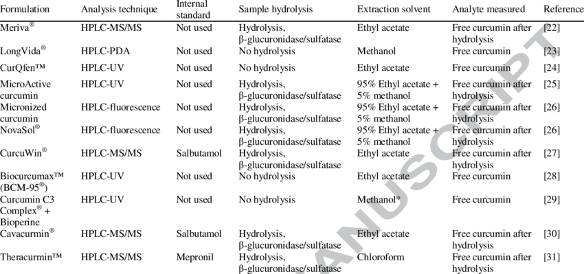그러나 그들의 연구에서 대부분의 커큐민 제형은 혈장 내 유리 CURCUMIN의 백분율(가장 높은 치료 가치)과 대사산물인 데메톡신쿠르쿠민, 비스데메톡시쿠르쿠민 및 테트라히드로쿠르쿠민을 설정하지 않습니다.