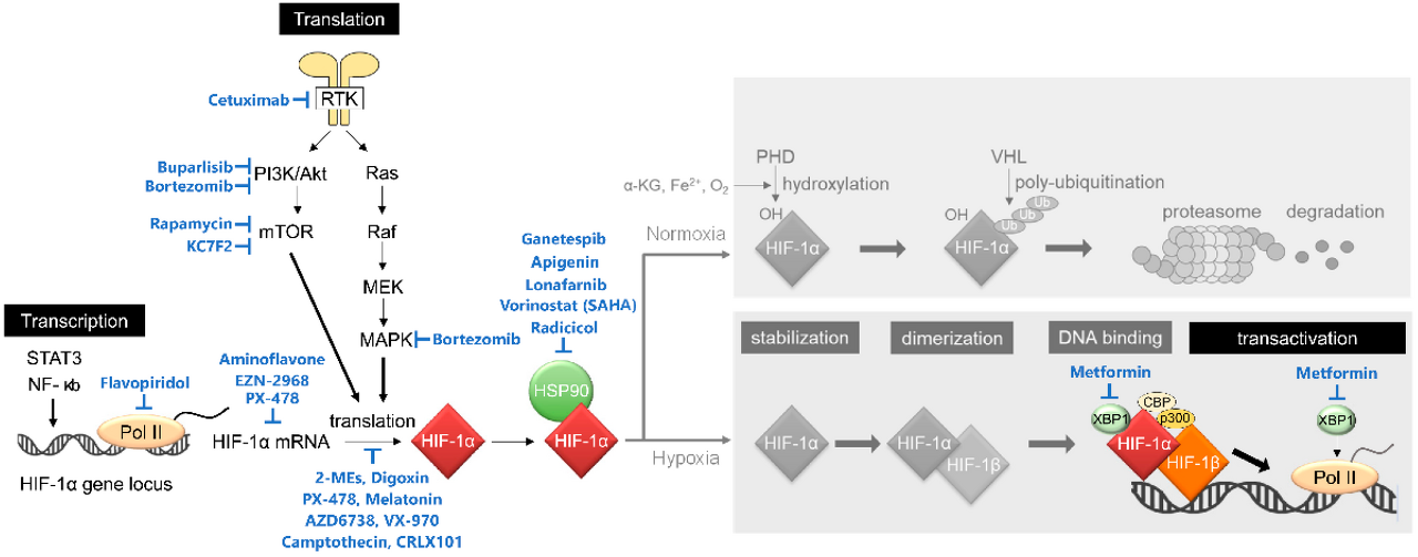 그림 1. HIF-1 및 HIF-1 억제제를 표적으로 하는 억제제 활성화 이면의 표준 조절 메커니즘.