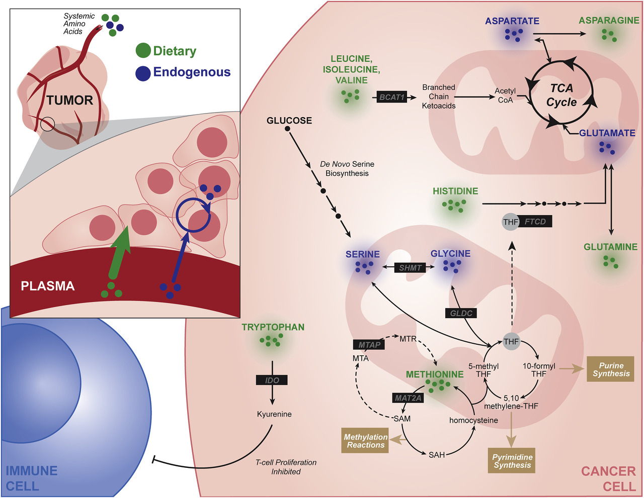그림 2 . 순환 아미노산은 암세포에서 대사되어 종양의 고유한 생합성 및 에너지 요구 사항을 제공합니다
