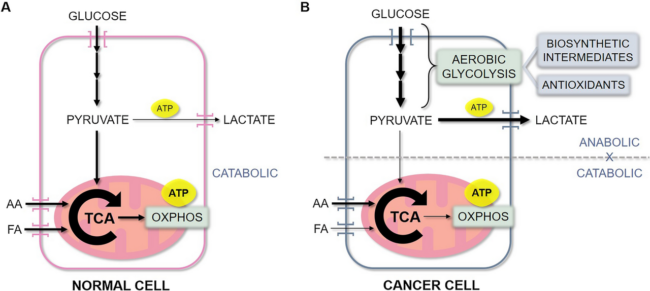 A 정상 세포에서 ATP 형태의 에너지는 일반적으로 미토콘드리아 TCA 회로 및 OXPHOS에서 생성된 생성물의 산화와 초기 분해(글루코스 분자당 소량의 ATP-2 ATP 생성)의 결합을 통해 포도당으로부터 얻습니다. (대량의 ATP 생성 - 포도당 분자당 34ATP).