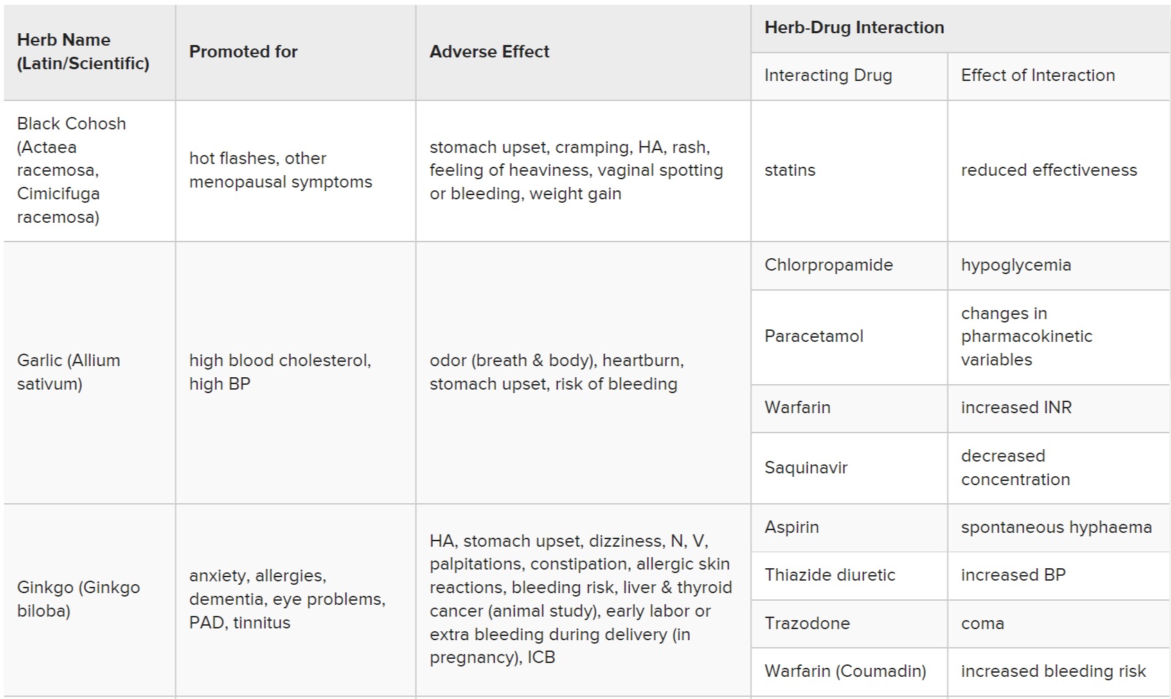 가장 흔한 허브의 부작용 및 허브-약물 상호작용 요약