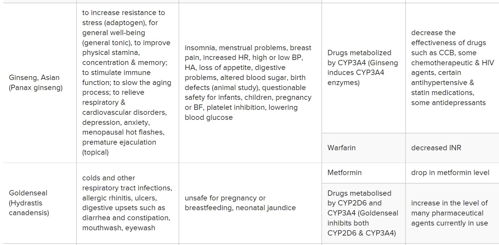 | Echinacea, Goldenseal, Licorice | Cytochrome P450 inhibitors (interacts with coumadin, cyclosporine, midazolam, oral contraceptives, testosterone, lidocaine, and digitalis) | |