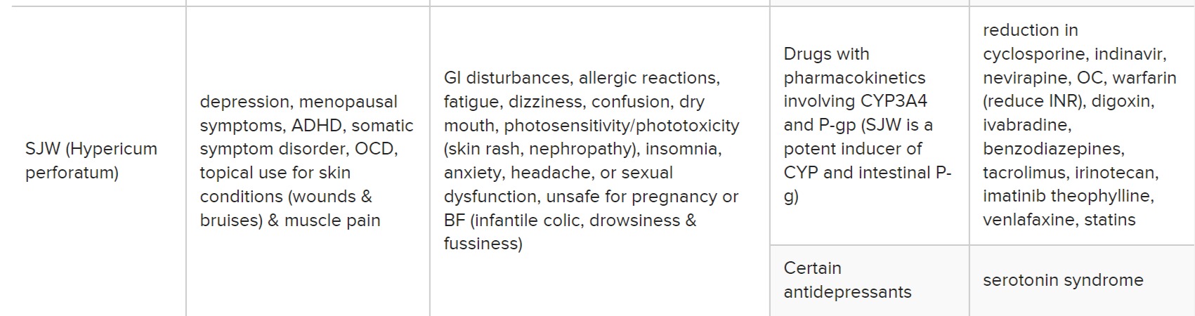 SJW: St. John’s Wort, INR: International Normalised Ratio, CYP: Cytochrome P-450 enzymes, P-gp: P-glycoprotein, BP: Blood Pressure, HR: Heart Rate, PAD: Peripheral Artery Disease, CCB: Calcium Channel Blockers, HA: Headache, N: nausea, V: vomiting, ADHD: attention-deficit hyperactivity disorder, OCD: obsessive-compulsive disorder, GI: Gastrointestinal, ICB: intracerebral bleeding, BF: Breast Feeding, OC: Oral Contraceptives