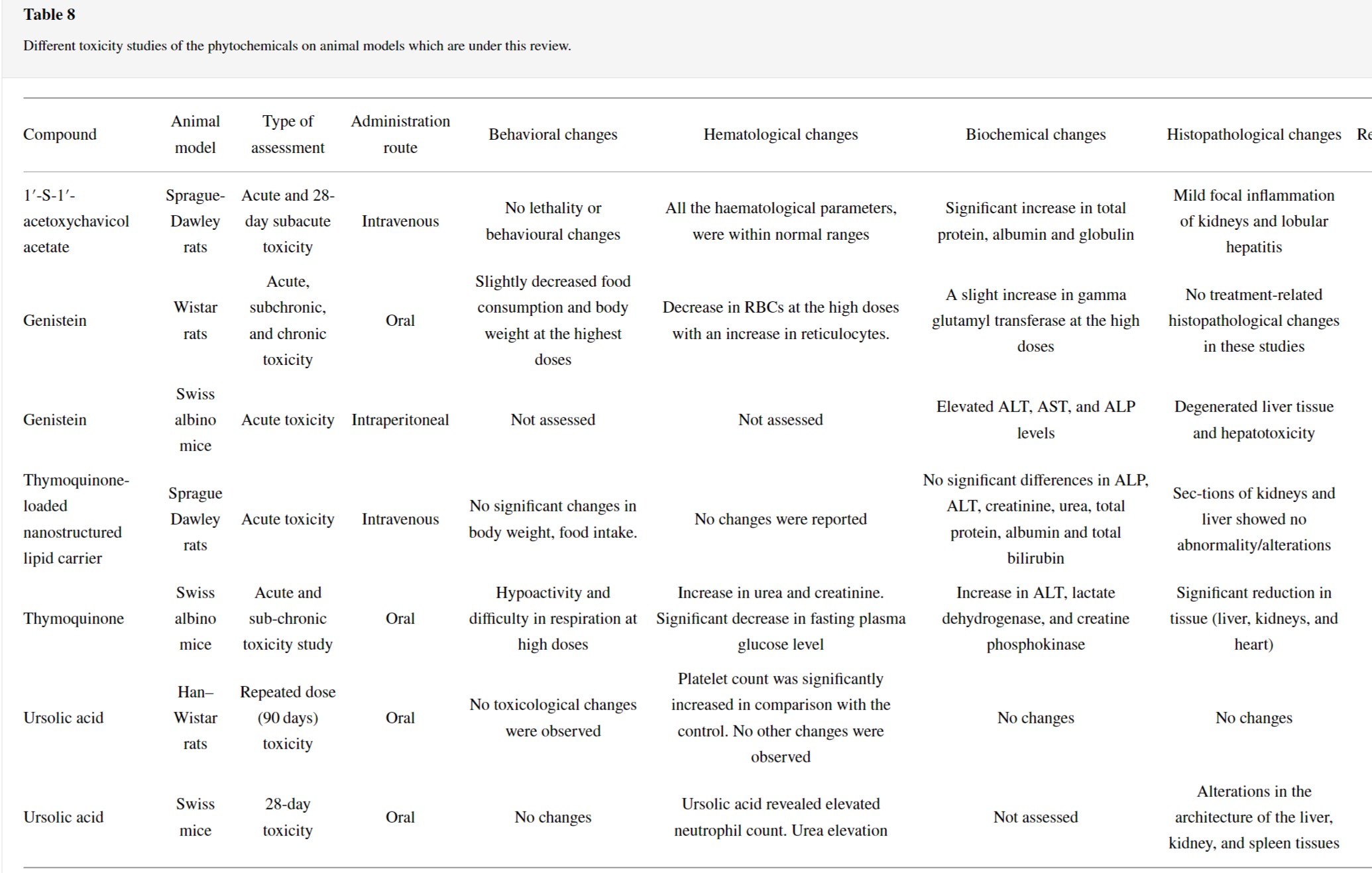 리뷰에서 논의된 대부분의 식물과 화합물은 간에 변화를 일으켰습니다(표 7 및 8 ).