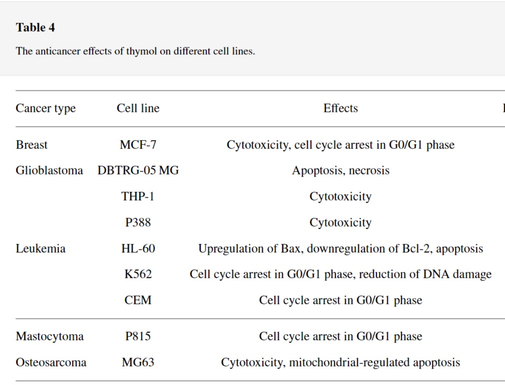 그 이후로 티몰은 항산화, 항염증, 항균, 항진균 및 항암 활성과 같은 유익한 약리학적 특성으로 활용되었습니다.