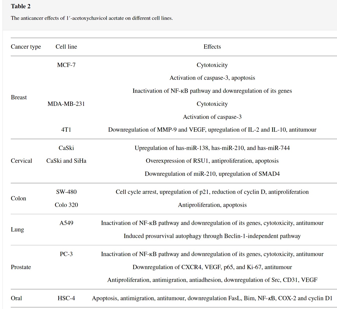 ACA의 가장 많이 연구된 약리학적 활성은 항종양 활성을 나타내는 능력이었다(표 2 ).