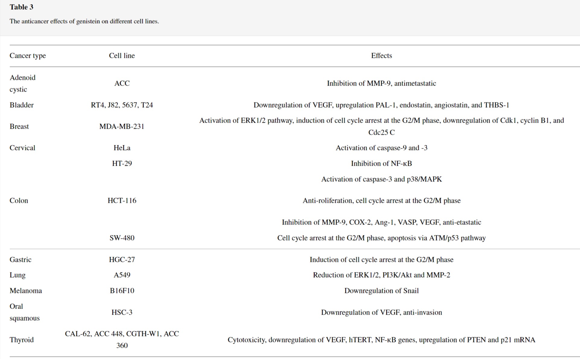 또한, 제니스테인의 항혈관신생 효과는 인간 방광암 세포, 구강 편평 세포 암종 및 갑상선암 세포에서 혈관신생 단백질인 혈관 내피 성장 인자(VEGF)의 하향 조절에서 입증되었습니다.