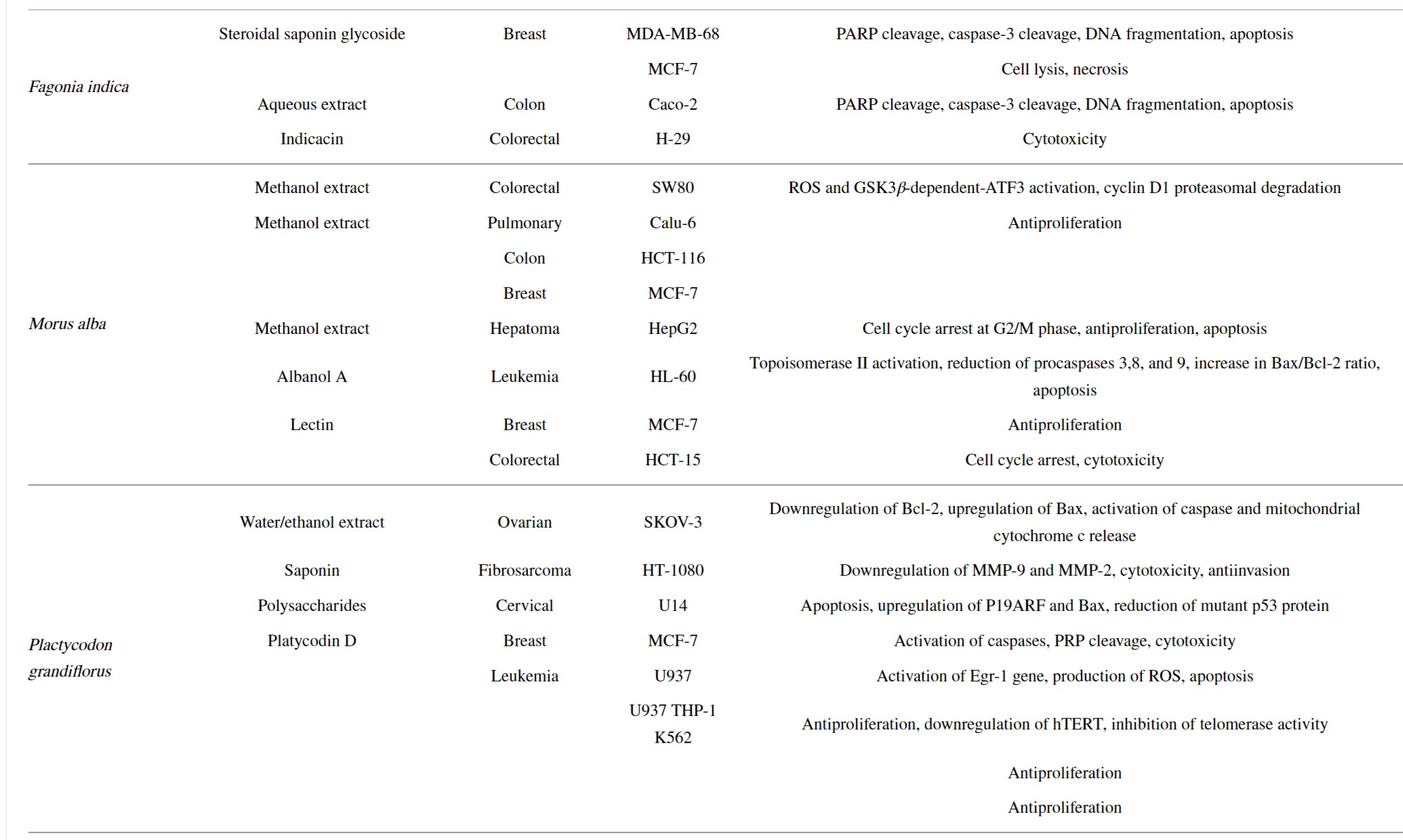 이 리뷰에서 연구된 식물 추출물은 A. baetica, M. alba, F. indica , P. grandiflorus, C. rhizoma 및 A. annua 의 수성 및 유기 추출물로 세포사멸 및 괴사를 유도하고 항증식, 항이동 및 시험관내 및 생체내 모두에서 여러 암 세포주에 대한 항-침습 활성.을 나타내는 것으로 밝혀졌습니다.