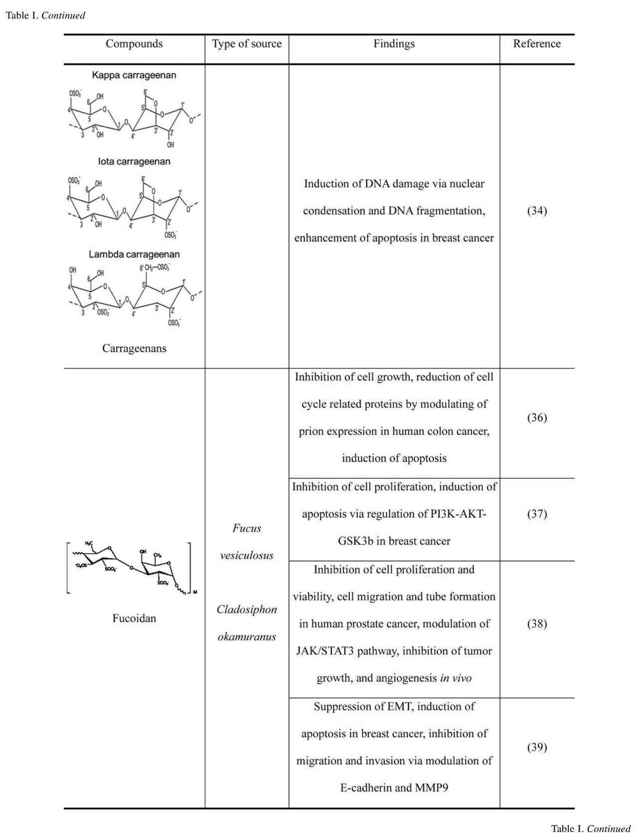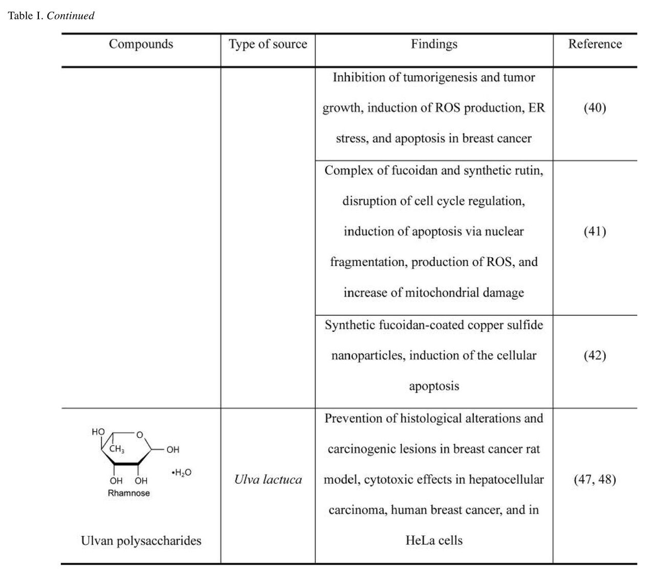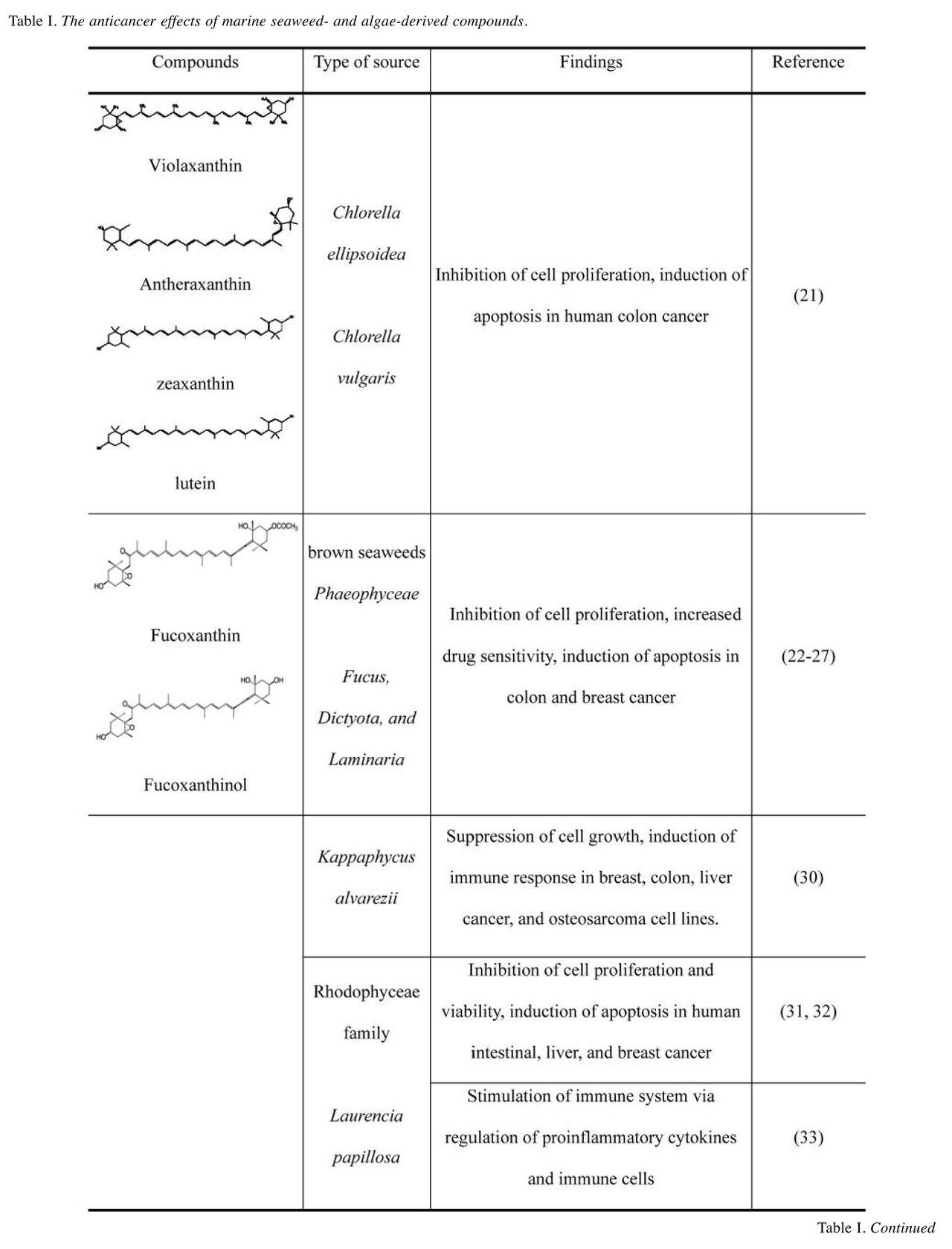 이러한 결과는 해조류 및 해조류에서 유래한 다양한 천연물이 세포독성 효과를 나타내며 새로운 암 치료제가 될 수 있음을 나타낸다( 표 1 ).