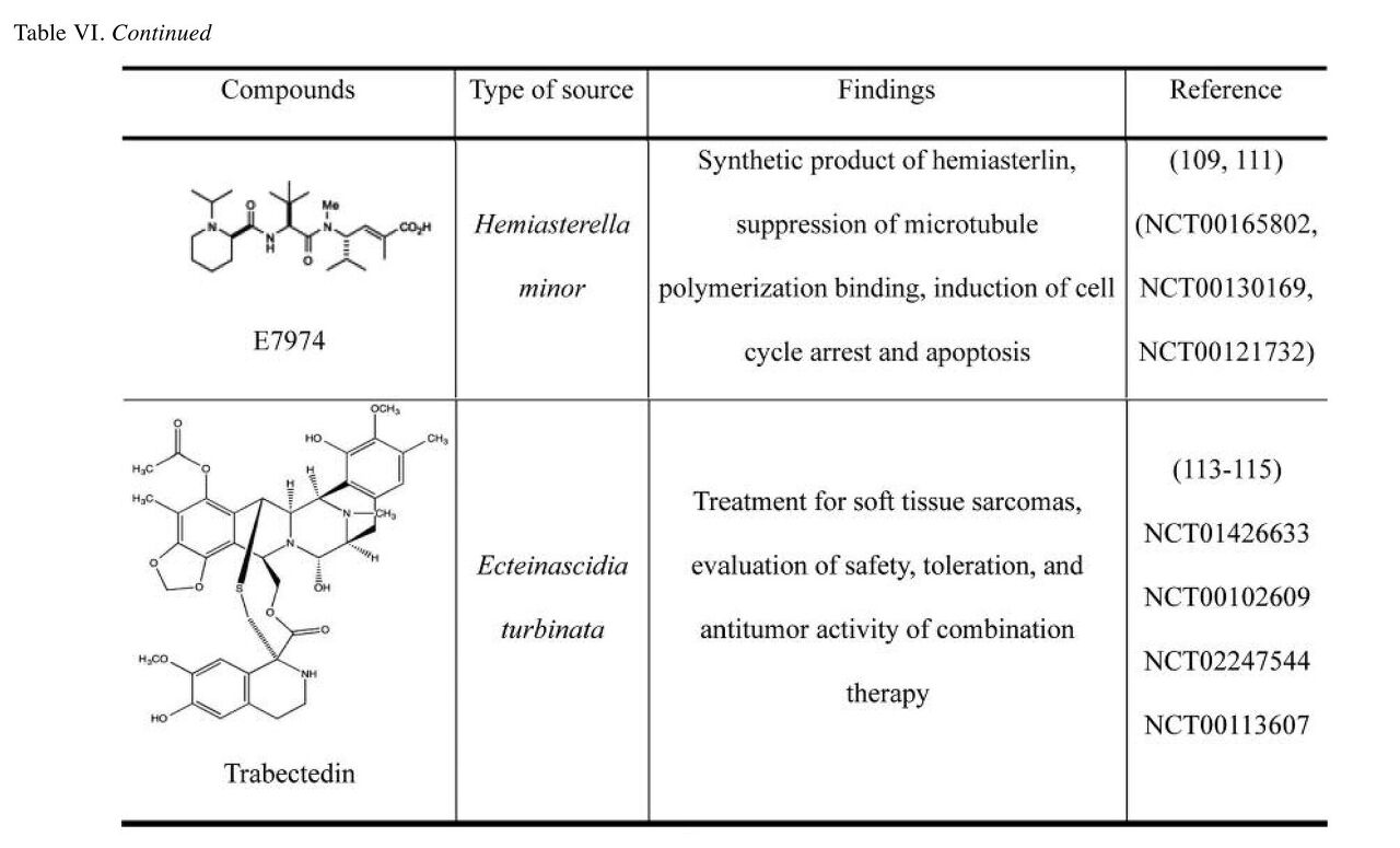 Trabectedin은 예비 임상 시험에서 연조직 육종의 치료에 성공했으며 진행성 연조직 육종 및 재발성 백금 민감성 난소암 치료에 대해 EU에서 승인되었습니다.