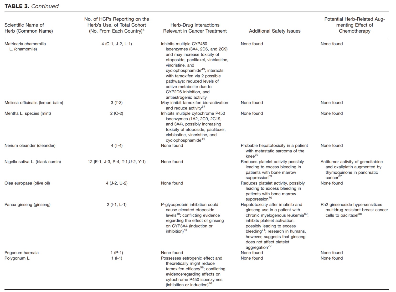 간독성 효과가 있는 약초 제품에는 이마티닙으로 치료받은 환자에서 Nerium oleander 및 인삼이 포함되었으며, 피하 투여된 Viscum album L에서 국소 알레르기 반응이 발견되었습니다.