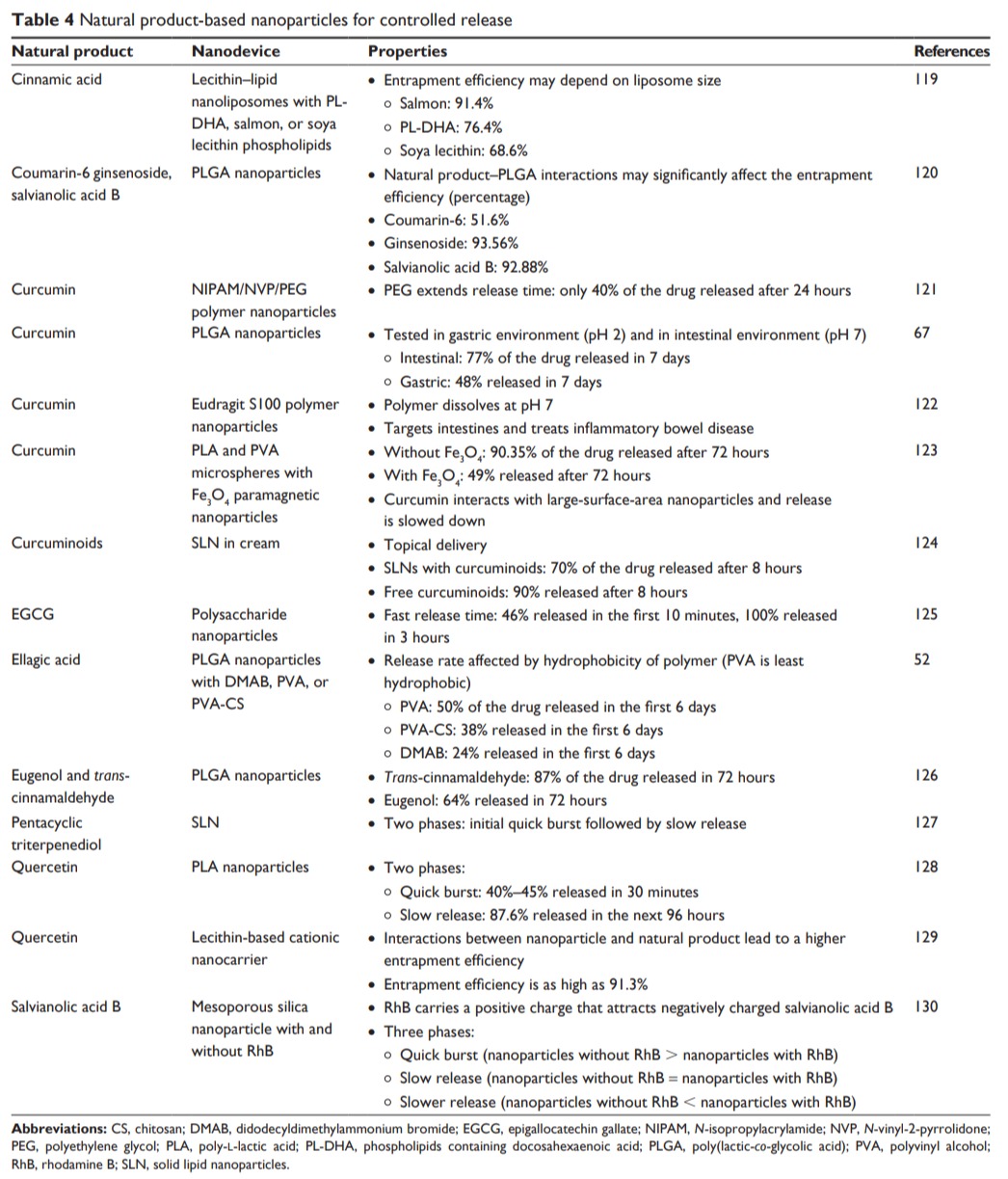 나노운반체는 커큐민, 파클리탁셀, 사이클로파민, 올-트랜스 레티노산, 레스베라트롤 및 실리비닌과 같은 NP가 표적 기관에 도달하기 전에 안정적인 형태를 유지하도록 하고 ( 그림 4 ),