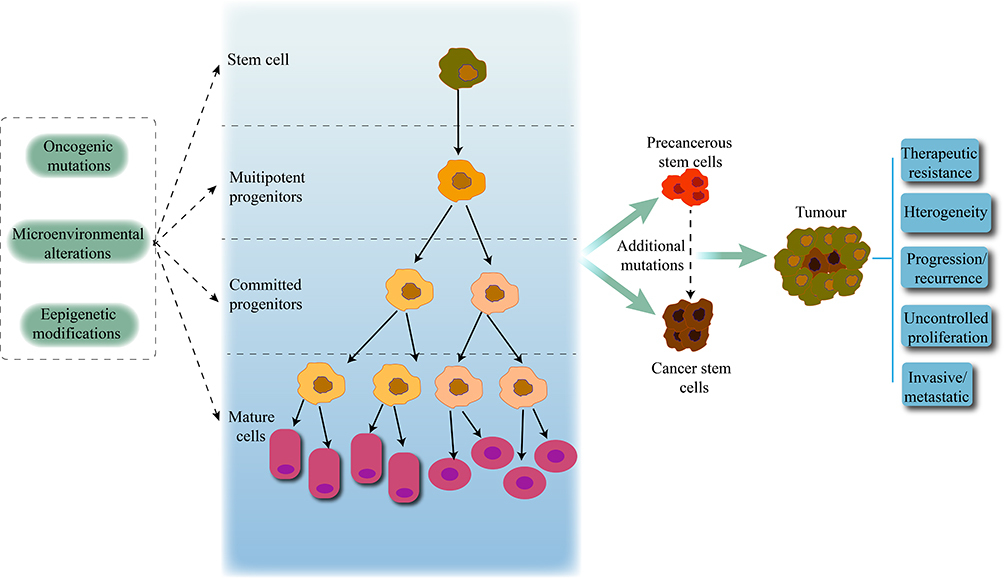 연구에 따르면 정상 줄기 세포는 첫 번째 발암성 돌연변이 이후 점차적으로 전암성 줄기 세포 및 CSC로 발전한 다음 돌연변이원 및 미세 환경의 영향으로 돌연변이를 추가로 축적하여 종양의 이질성을 증가시켜 제어되지 않은 세포 성장 및 종양 발달, 전이, 치료 저항성 및 재발 을 촉진하는 것으로 나타났습니다. 20 , 21 ( 그림 1 ).