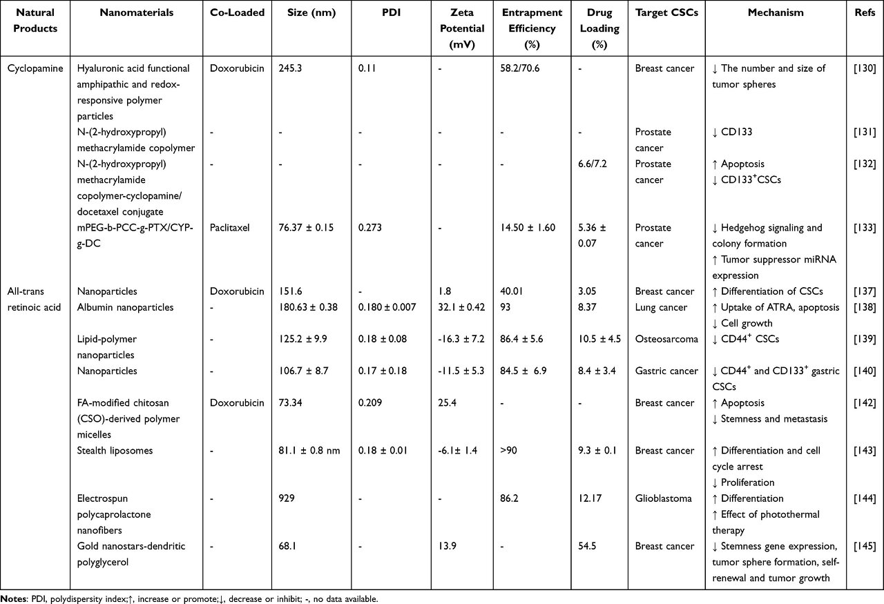 나노 입자에 캡슐화된 ATRA는 분해로부터 보호할 것으로 예상되며 ATRA를 CSC로 표적화하면 CSC가 더 분화된 상태로 이동하도록 자극하여 화학 요법에 더 나은 반응을 보일 수 있습니다( 표 3 ).