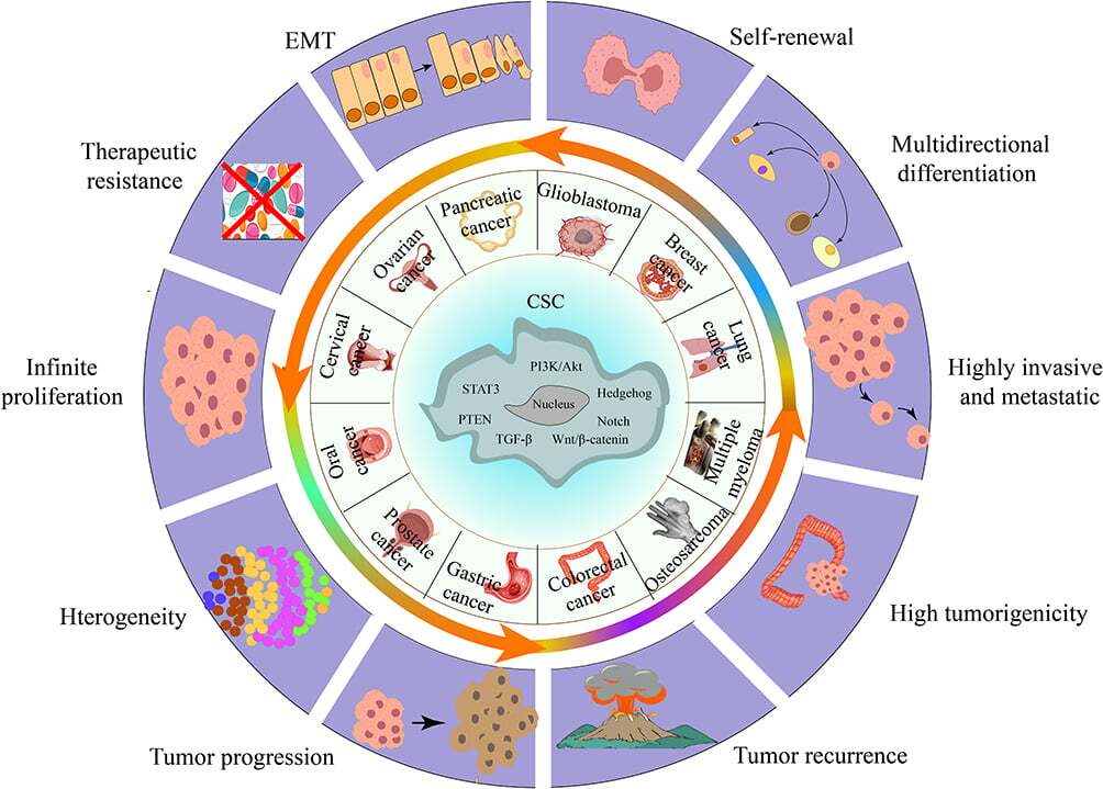 암 줄기 세포(CSC)는 높은 자가 재생, 다방향 분화 가능성 및 종양 형성 능력을 가진 종양 조직의 특수화된 세포 하위 집합이며 악성 증식, 침습, 전이, 약물 내성 및 종양 재발의 원동력입니다.
