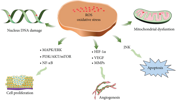 세포 내 ROS 수준은 암과 강하게 연관되어 있습니다. 한편으로 대부분의 암세포는 더 높은 ROS 수준을 특징으로 합니다. 암 세포주에서 Warburg 효과로 인해 빠른 증식 속도를 유지하려면 높은 ROS 수준이 필요합니다. 초기 단계에서 ROS는 핵 및 미토콘드리아 DNA 돌연변이를 일으킬 수 있으며, 이는 게놈 불안정성을 유발하고, 그 후 일련의 신호 전달 경로가 활성화됩니다. 이 과정은 종양 변형을 촉진할 수 있습니다[ 104 , 105 ]. 또한, ROS는 후성유전학적 변형을 통해 종양유전자 및 억제인자의 발현에 영향을 미칠 수 있습니다[ 106 , 107 ][ 108]. ROS는 종양의 모든 병리학 적 과정에 관여하는 것으로보고되었으며 ROS는 PI3K / AKT 및 MAPK / ERK 경로와 같은 많은 증식 관련 유전자를 조절할 수 있습니다 [ 109 ]. 종양 관련 신생혈관 형성은 종양 성장의 또 다른 중요한 단계입니다[ 110 ]. ROS는 내피 세포 증식과 생존을 촉진할 수 있습니다[ 111 ]. 또한 VEGF 경로는 혈관신생을 촉진하는 ROS에 의해 활성화될 수 있습니다[ 112 ]. 전이와 관련하여 ROS는 FAK를 활성화하여 종양 세포 이동을 향상시킬 수 있으며 [ 113 ], ROS는 MMP 및 카텝신과 같은 많은 단백질 분해 효소를 활성화하여 이동 과정을 촉진할 수 있습니다 [ 114]. 반면에 높은 ROS 수준으로 인한 산화 스트레스는 포괄적인 모델에서 세포 주기를 억제하고 종양 세포 성장을 제거할 수도 있습니다. ROS는 다양한 경로를 통해 종양 세포 사멸을 조절하는 것으로 나타났습니다[ 24 , 115 ].